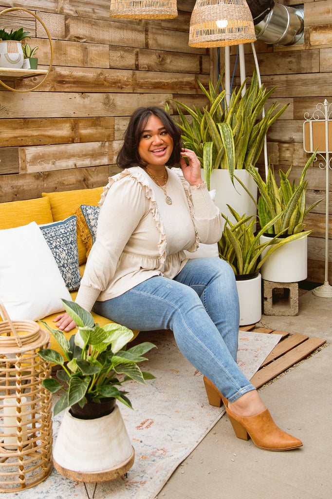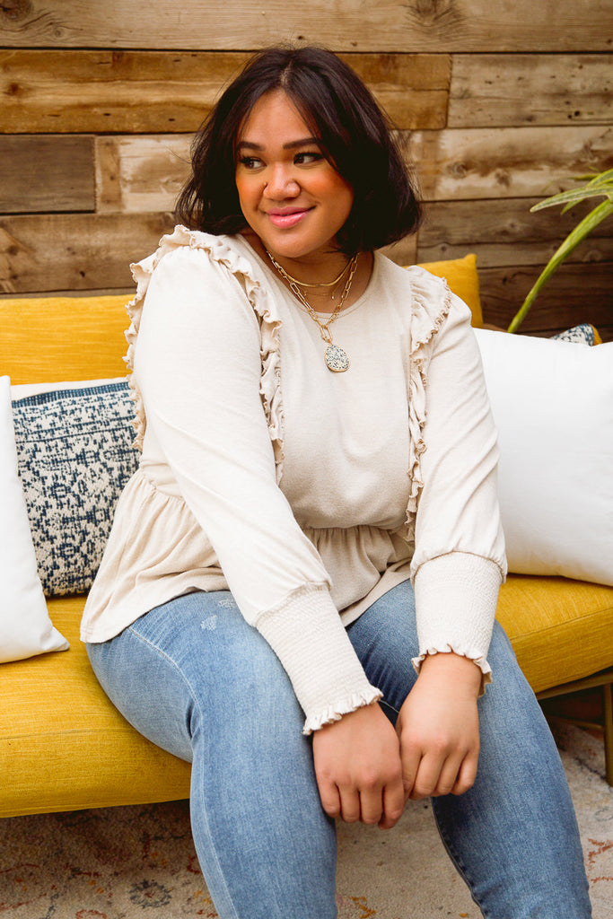Keywords: Tan, Ruffle Top, Long Sleeve, Sweater